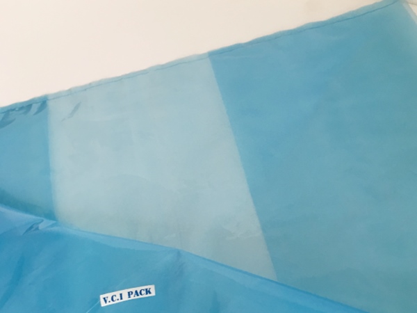 VCI氣相防銹膜(防銹袋)是將高分子聚乙烯樹脂(LDPE)與功能VCI樹脂配比混合,采用現(xiàn)代薄膜共擠技術(shù)生產(chǎn)的新一代復(fù)合防銹薄膜。具有良好的氣化防銹性能、阻隔防潮、使用方便、透明直觀等特點(diǎn);當(dāng)用塑料袋包裹金屬產(chǎn)品時,氣相緩蝕劑在封閉空間內(nèi)氣化并凝聚在所有金屬表面上形成氣相保護(hù)層,從而防止金屬產(chǎn)品銹蝕。符合GB-T19532-2004防銹性能要求。